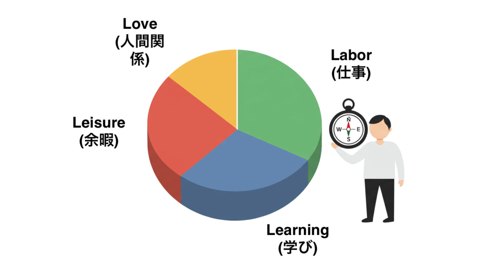 私たちが「あの時、もっと~しておけばよかった」と後悔する時、その多くは、人生を構成する4つの大切な要素、すなわち「Labor(仕事)」「Love(家族・友人・人間関係)」「Leisure(余暇)」「Learning(学び・成長)」のいずれかに、もっと時間やエネルギーを注いでおけばよかった、という気持ちから生まれます。