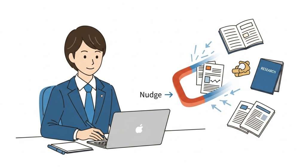 - 例: 越境コミットメントで「週に一度、他部署の進捗をリサーチする」と決めたとします。しかし、「リサーチツールの立ち上げが面倒」「どのフォルダに保存するか毎回迷う」といった小さな手間(摩擦)が続くと、人は「今日はやめておこう」と簡単に諦めてしまいます。摩擦を特定し、除去することが、ナッジ設計の最初の、そして最も重要なステップです。
