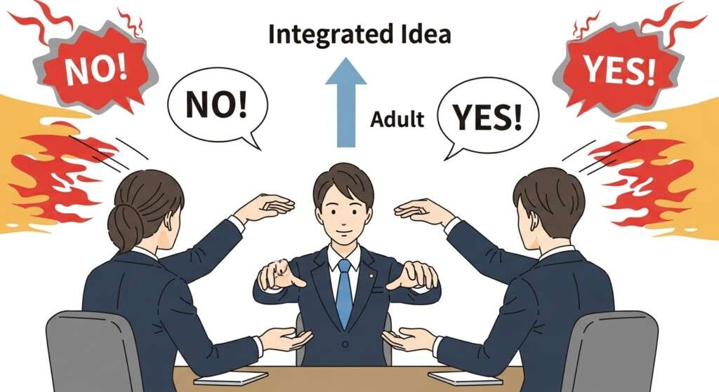 - 統合への道:: 異論が出尽くした後、リーダーは決して多数決に頼らず、「異論の裏にある、私たちがまだ見落としている真の前提は何か?」というAdultの質問を投げかけ、異質な知の融合を図ります。