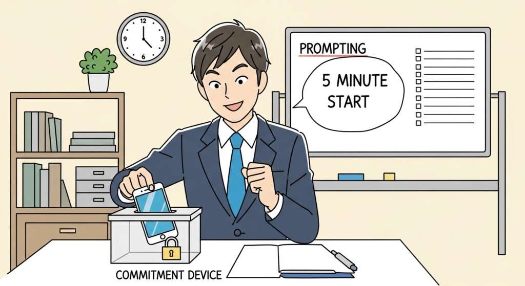 双曲割引に打ち勝つ最強のツールが、「コミットメントデバイス」です。これは、「未来の自分がサボろうとしても、それができなくなるように、今の自分が物理的・心理的な制約を設ける」ことです。非合理な自分(Cモード)の行動の自由を、論理的な自分(Aモード)が意図的に奪うことで、未来の貢献行動を確実にします。