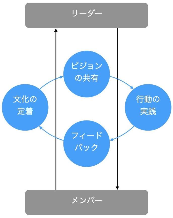 組織文化は、リーダーがビジョンを提示し、メンバーがそれを行動に移し、その行動が新たな規範となり、再びリーダーの意思決定やメンバーの認識に影響を与えるという、ダイナミックな循環の中で進化します。