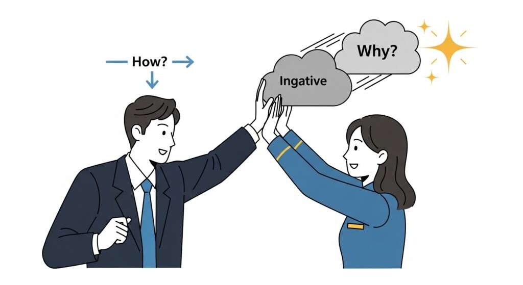 具体的には、「なぜ?」を「どうすれば?」や「次は何を?」に置き換えることで、質問の主語が「あなた」から「行動」へと変化します。
