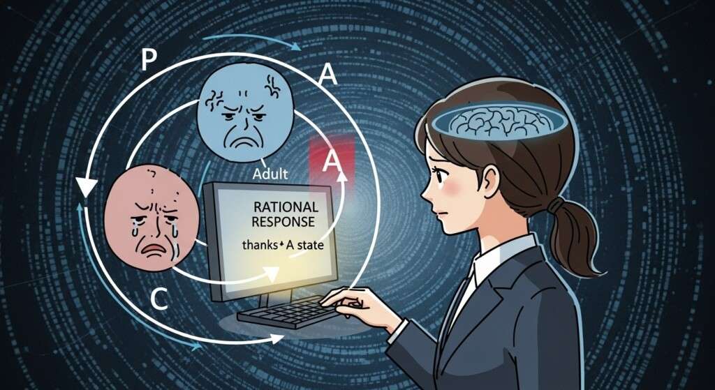 - 大人(Adult:A): 客観的な情報を収集し、論理的かつ合理的に判断し、問題解決を行う状態。「事実に基づき、今、最も適切な行動は何か」を選択する、冷静な理性です。これは、現実のデータ処理装置です。