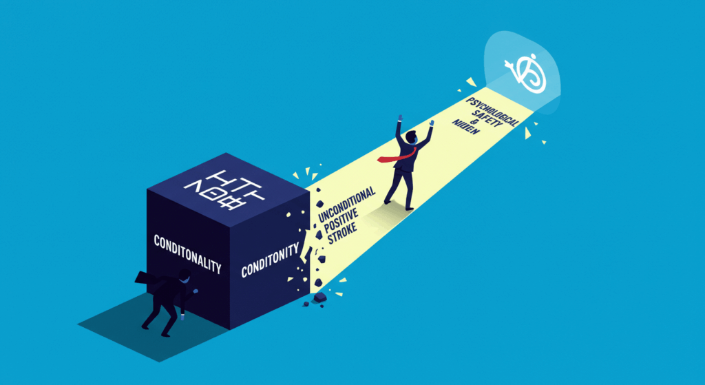 今日は、その答えの核となる「無条件の肯定的ストローク(存在の承認)」に焦点を当てます。これは、単なる優しい言葉ではありません。「あなたがこのチームにいてくれることが、最も価値あることだ」という、リーダーからの揺るぎないメッセージであり、自律型社員を育成するための、最も強固な土台です。この承認こそが、あのGoogleの研究でも最重要ファクターとされた「心理的安全性」を生み出すからです。