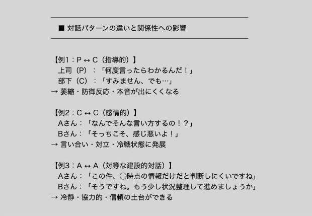 • 相手を“指導”するのではなく、“対話”を心がける
