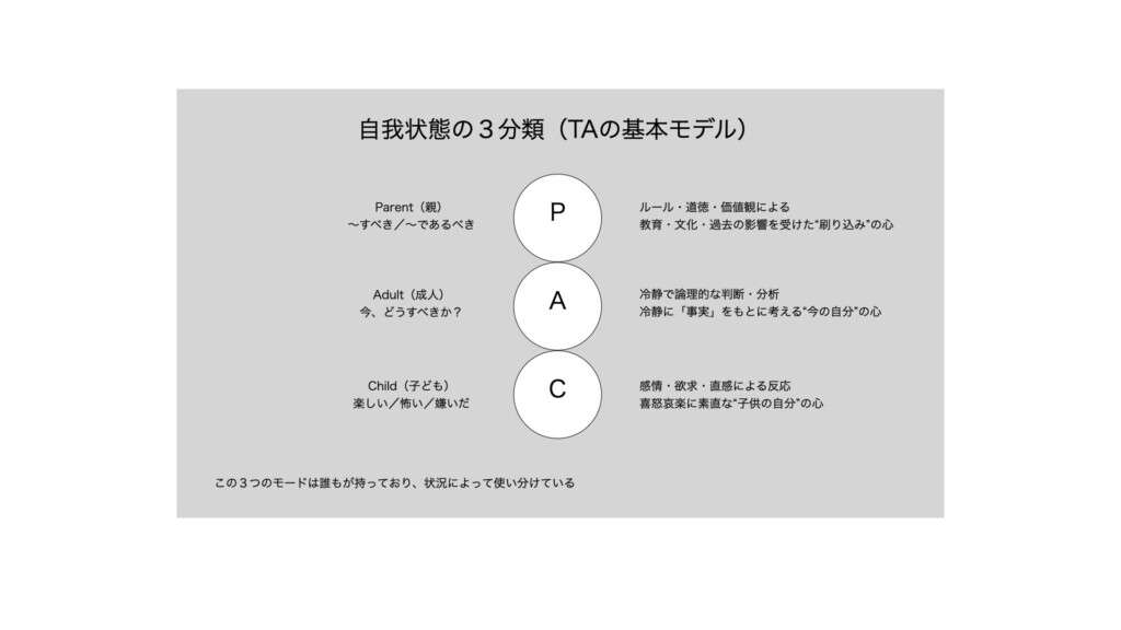 TAでは、私たちの心は、以下の3つのモード(自我状態)で構成されていると考えます。